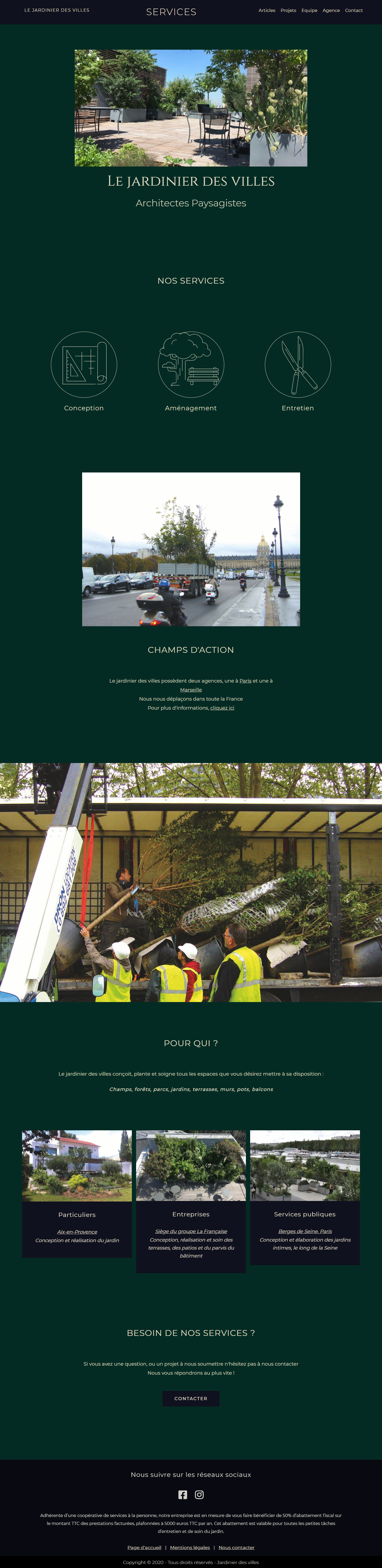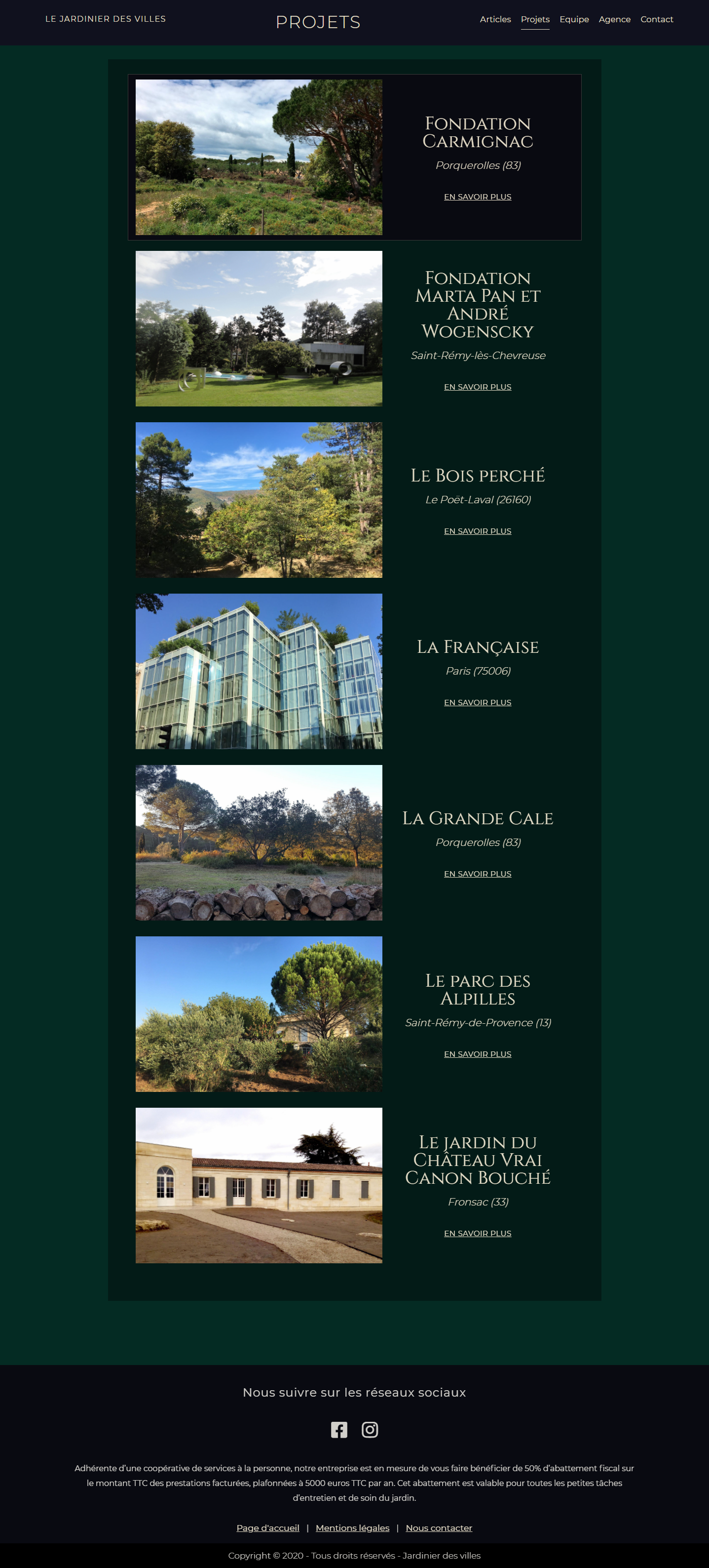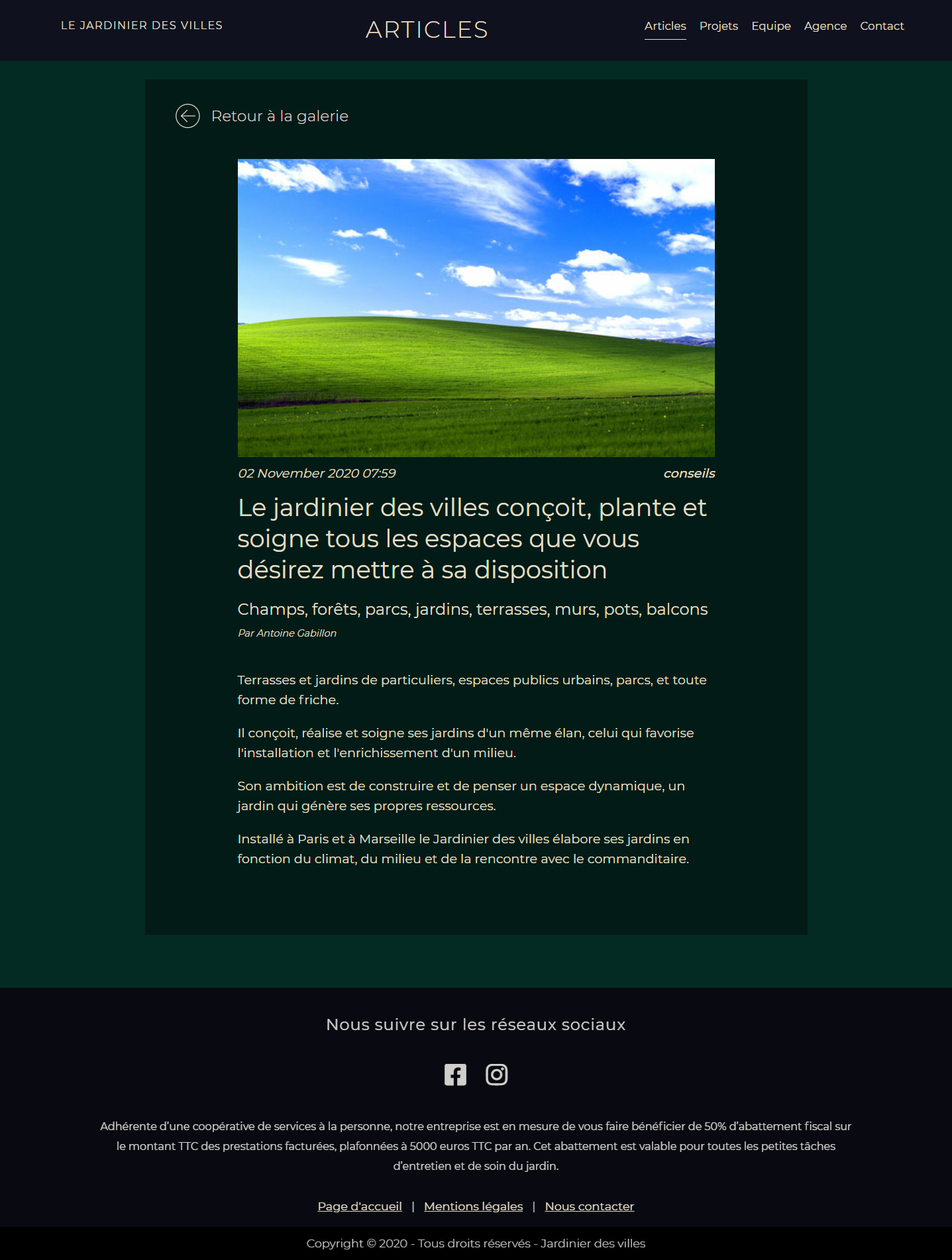 Projet personnel - Site vitrine pour un jardinier des villes, création d'un site présentant les services offerts par le jardinier des villes ainsi que les différents projets réalisés par celui-ci. Un back-office a été créé pour gérer le contenu du site.